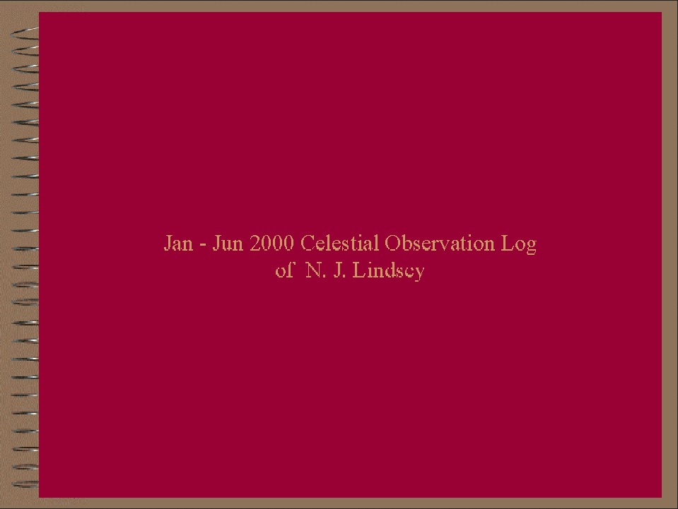 Log of Nancy J. Lindsey's Jan - Jun 2000 (UND-SPST 425) observations with the naked eye, Tasco 4.5 reflector telescope, and UND 16" Schmidt-Cassegrain Telescope. Observartion include aurora, sunspots, planets, galaxies, nebula, comets, distant-stars, and Messier objects. Click cover image to open logbook.